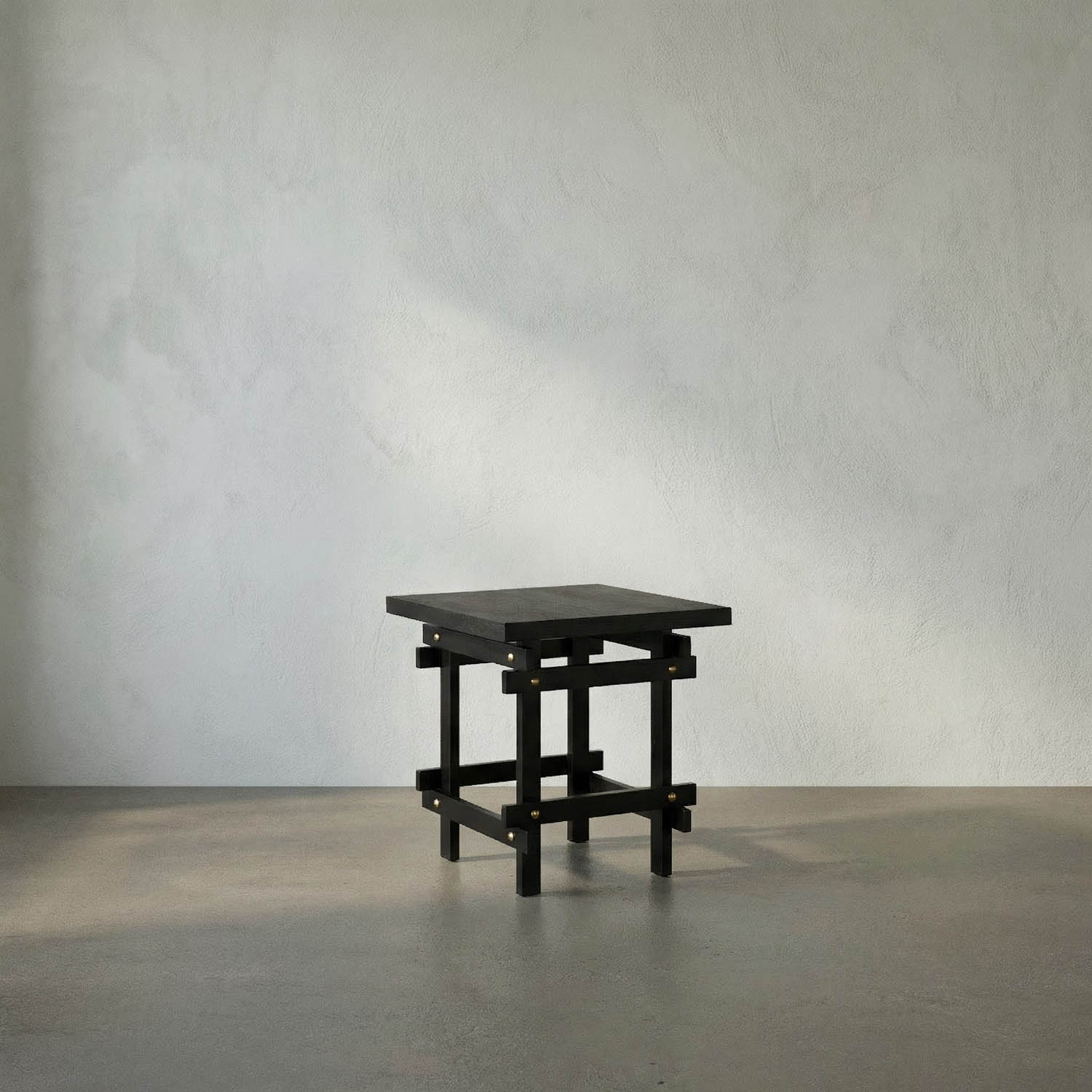 This square side table showcases a stacked wood design inspired by Japanese minimalism, featuring a blocky, geometric shape and brass accents, making it a functional and elegant accent table.