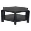 The Yuhuda Coffee table features a hexagonal design with facetted, arrow-shaped legs and a handsome starburst marquetry veneer top and lower shelves. It is finished in our unique Cinder Black ceruse rub finish that highlights the natural wood grain, making each piece truly unique.
