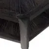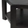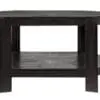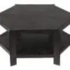 The Yuhuda Coffee Table features a bold hexagonal shape with faceted, arrow-like legs. Its dark wood finish highlights a striking starburst marquetry pattern on both the top and lower shelf, blending sculptural form with rich texture.