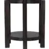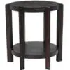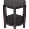 The Yuhuda Side Table features a bold hexagonal shape with faceted, arrow-like legs. Its dark wood finish highlights a striking starburst marquetry pattern on both the top and lower shelf, blending sculptural form with rich texture.