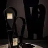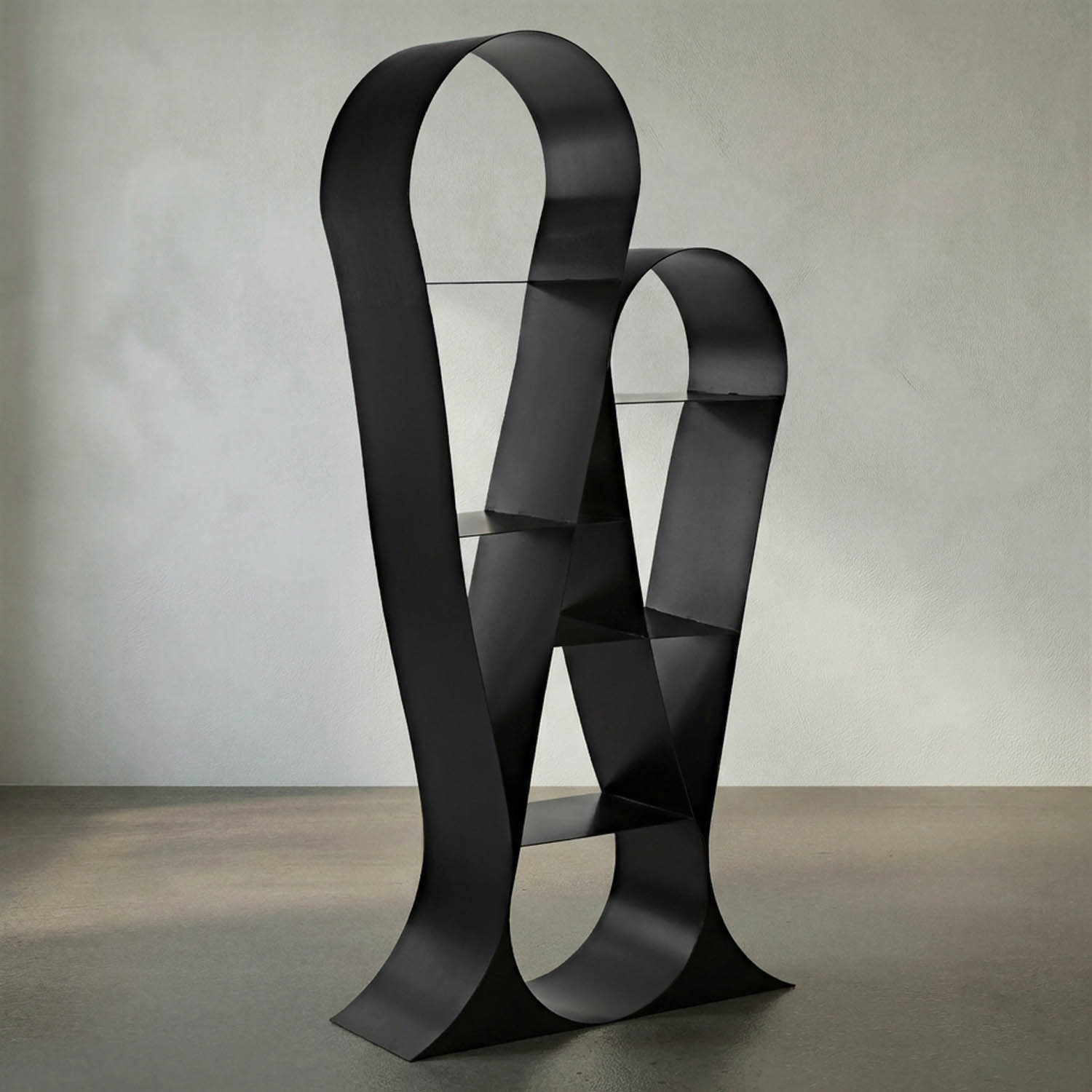 Crafted from solid iron and finished in a matte black finish, this statement bookcase suggests massive ribbons or loops in lyrical repetition with intersecting shelves.