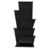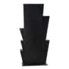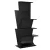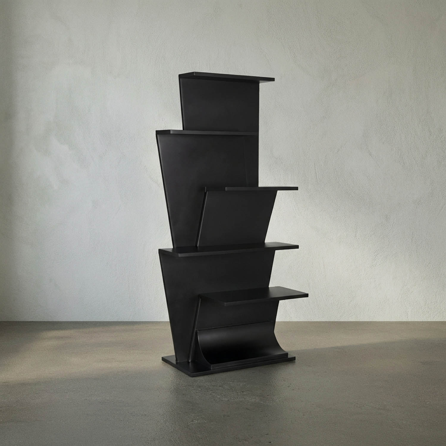 The angular bookcase features a stepped zigzag profile in matte black, with tiers extending at varying depths. This sculptural design combines bold asymmetry with functional surfaces, creating an architectural statement .