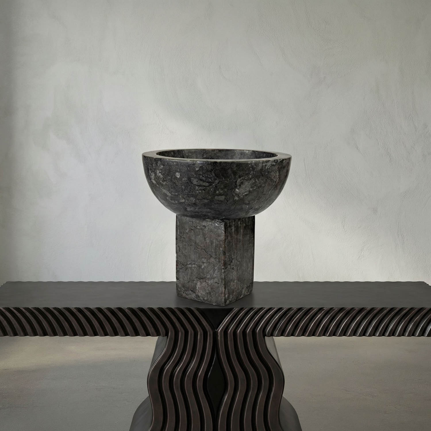 The Zeta Bowl features a bold design made from a sliced sphere and a cube base. Made from solid black marble with natural patterns, each bowl is one-of-a-kind.