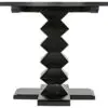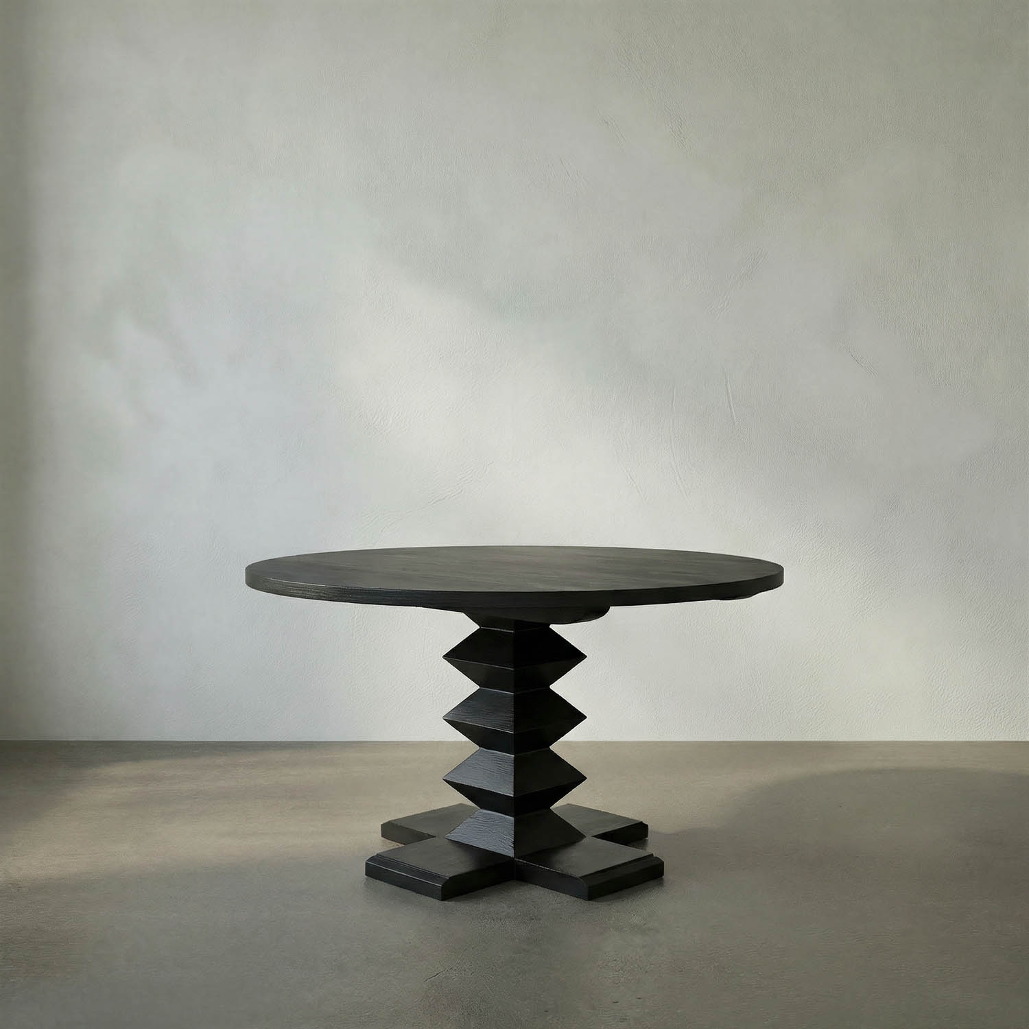 A sleek, round table with a 48″ diameter in Hand-Rubbed Black finished mahogany features a striking geometric “zig-zag” sculptural base, creating an artistic statement that blends mid-century inspiration with timeless craftsmanship.