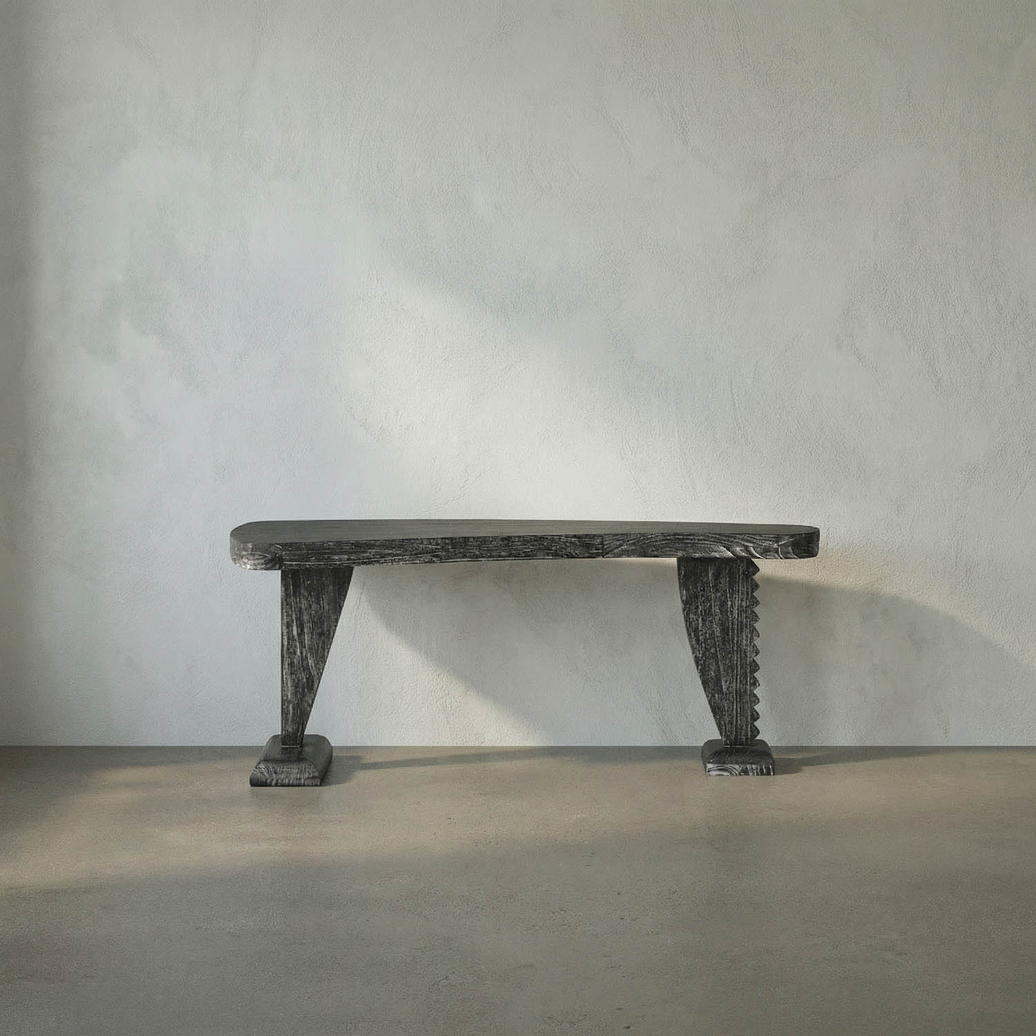 The Zigmund Desk makes a bold statement with clean lines, a sculptural form, and tapered block legs featuring a zig-zag design that evokes Brutalist architecture–elemental and uncompromising in its minimalism.