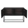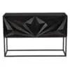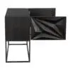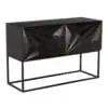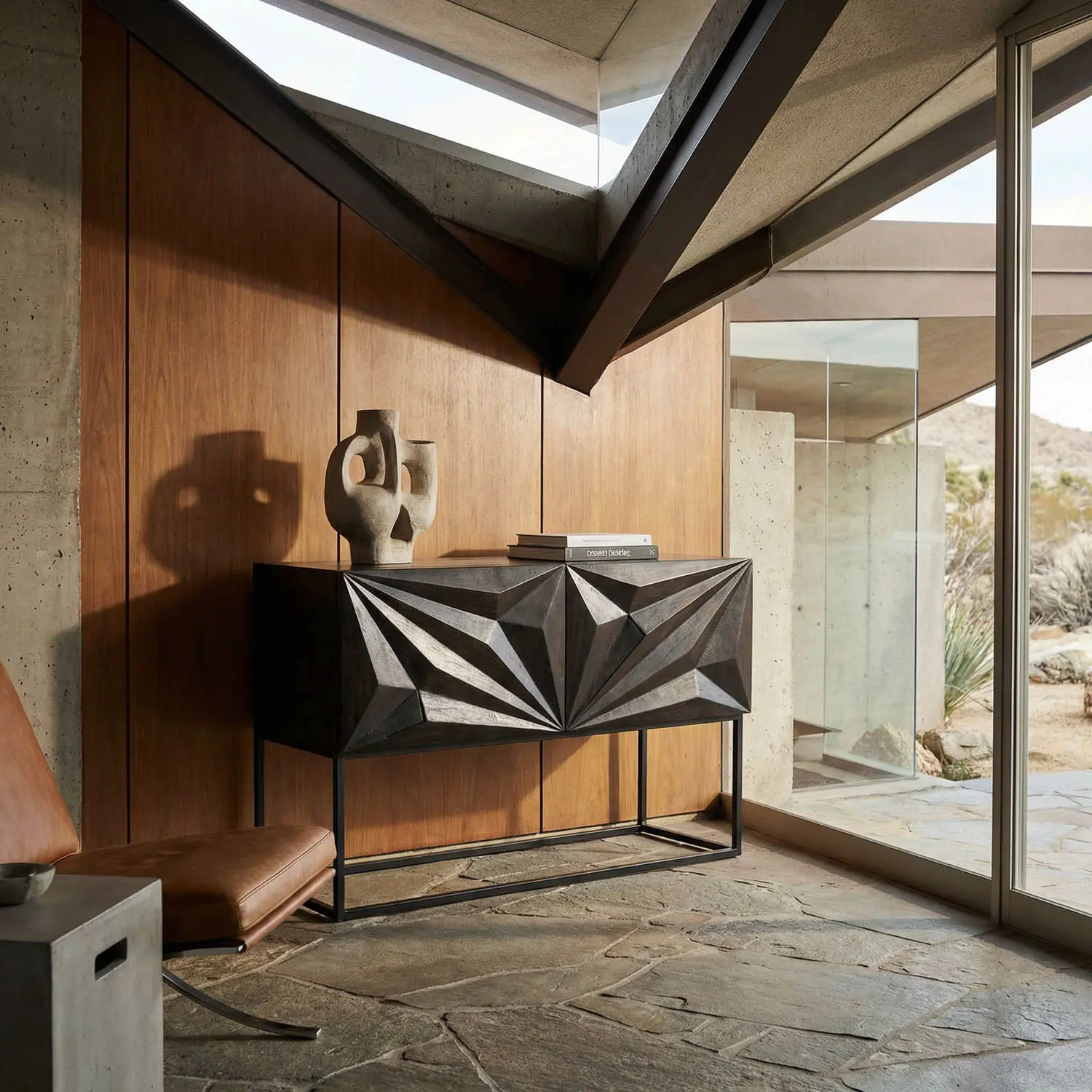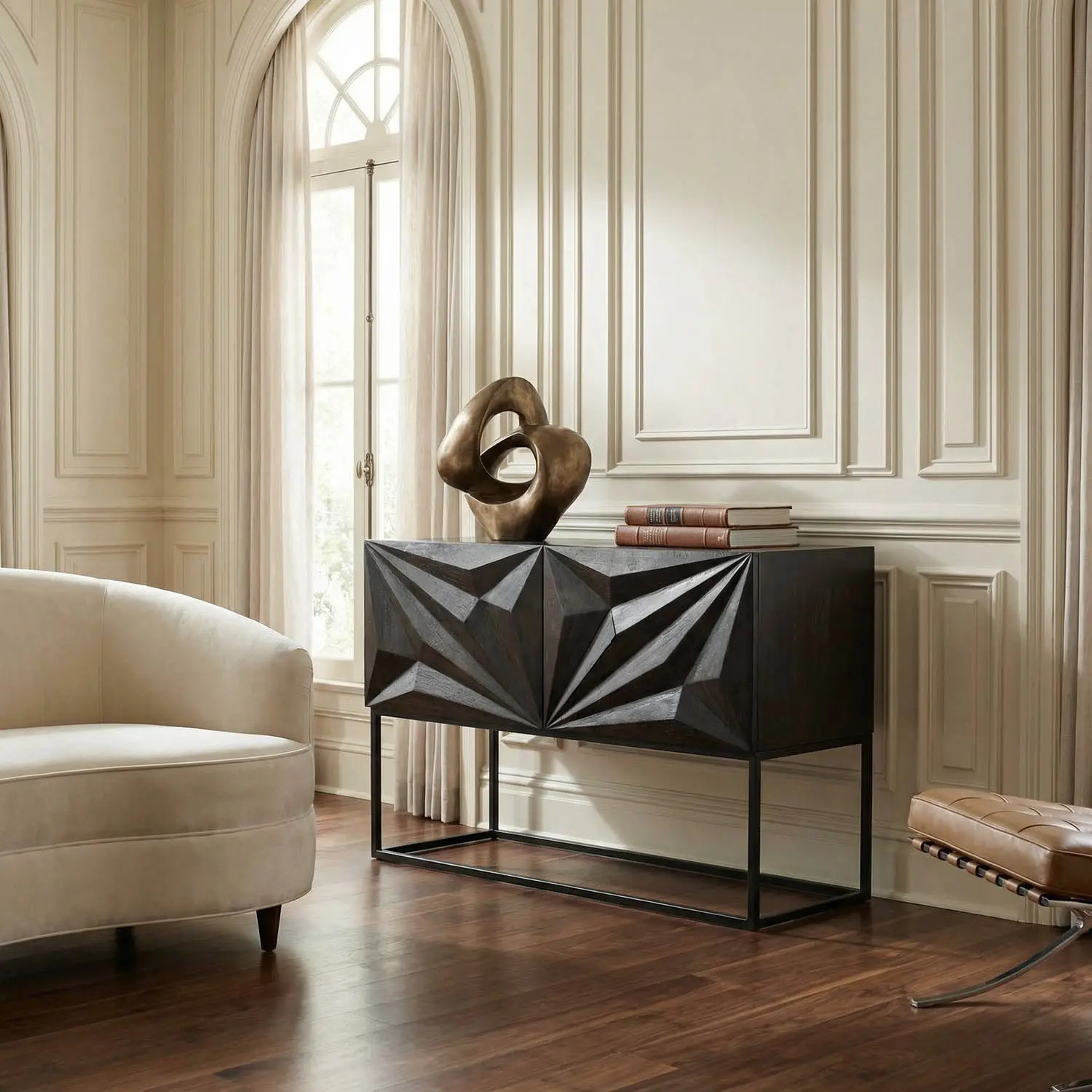 This two-door console in Ebony Walnut features bold, faceted front panels carved in a striking geometric starburst design. Elevated on a minimal black metal frame, it blends sculptural detail with modern sophistication and functionality.