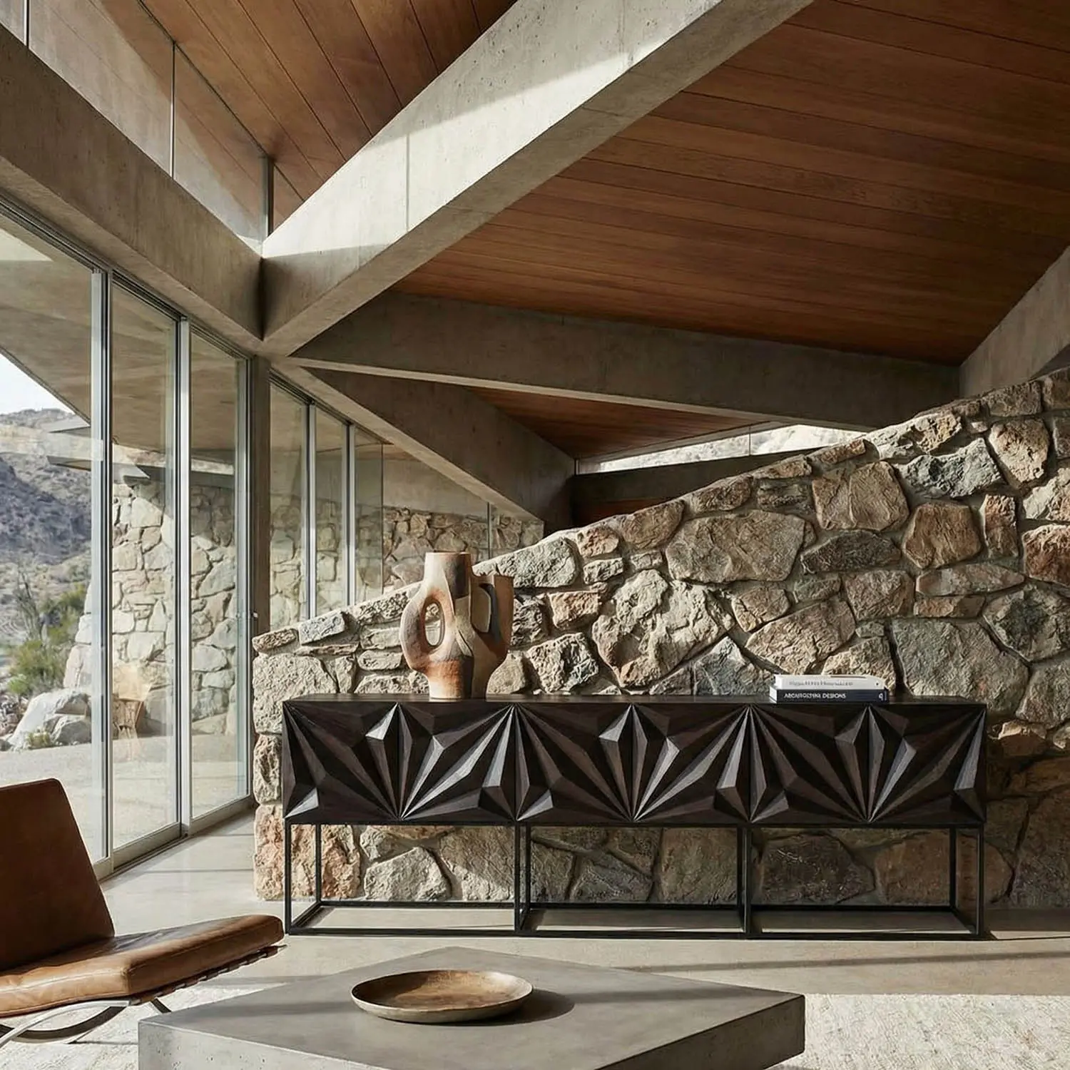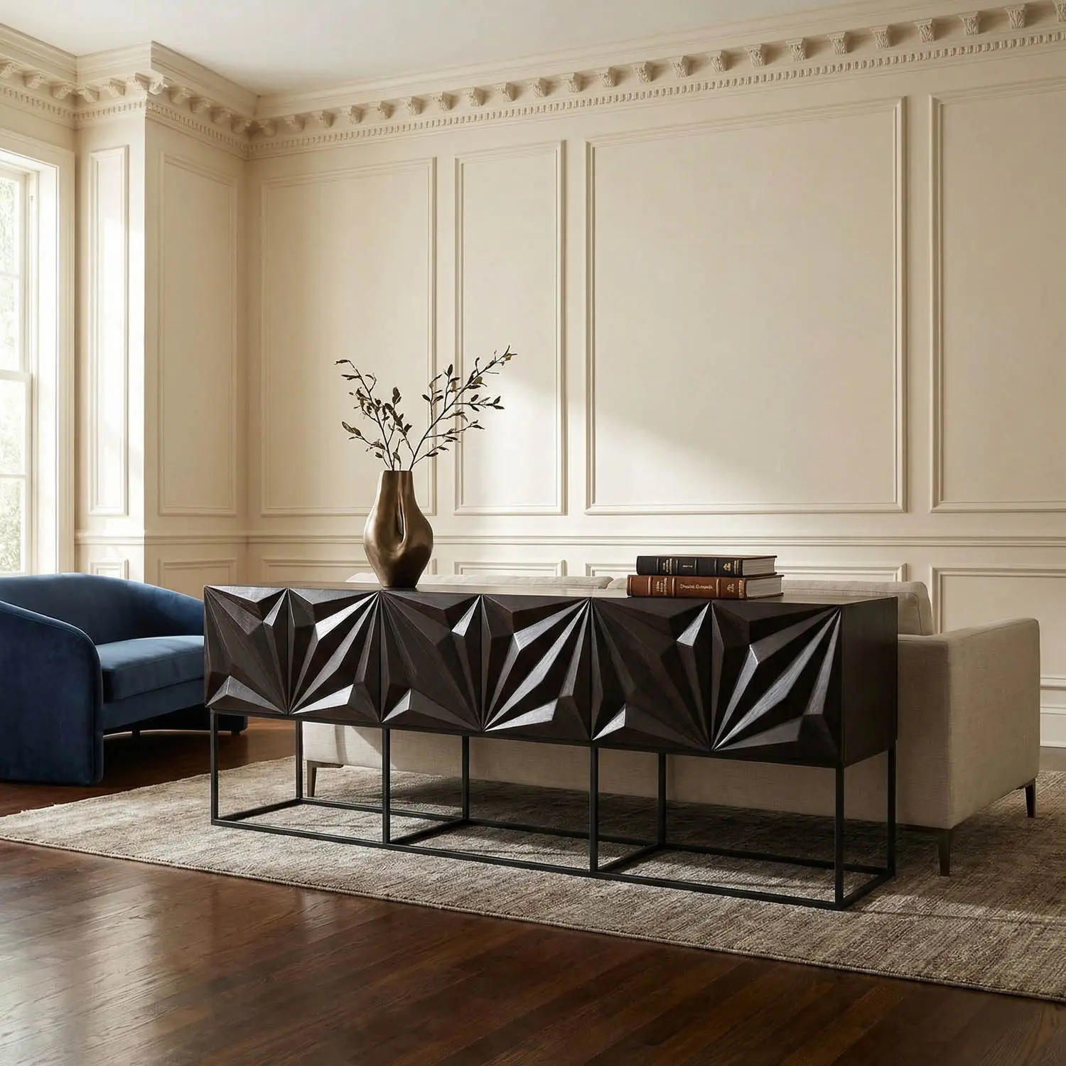This oversized six-door console, finished in Ebony Walnut, features bold, faceted front panels carved in a striking geometric starburst design. Elevated on a minimal black metal frame, it blends sculptural detail with modern sophistication and functionality.