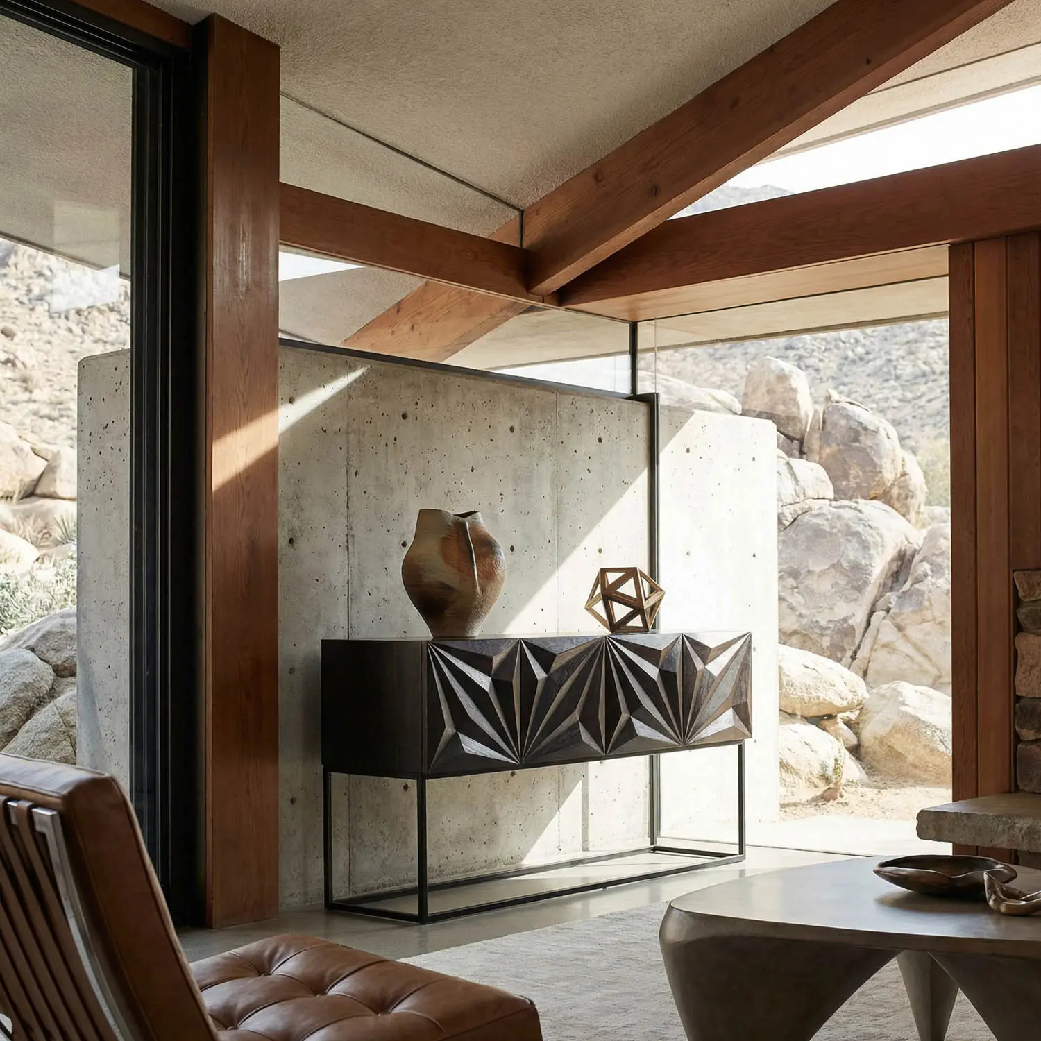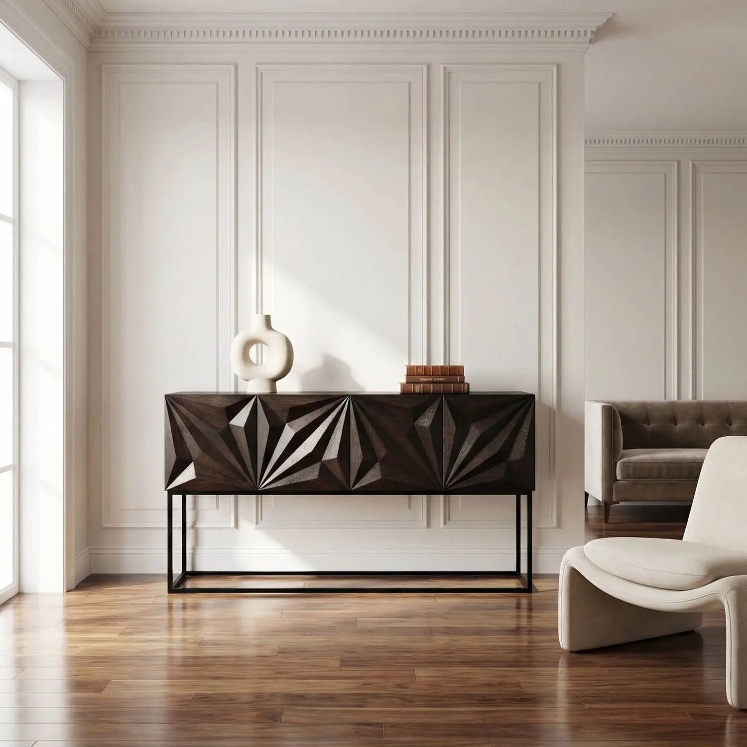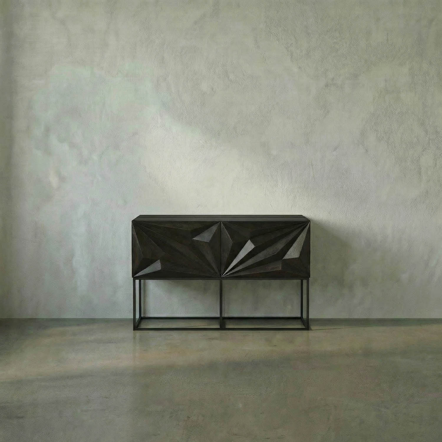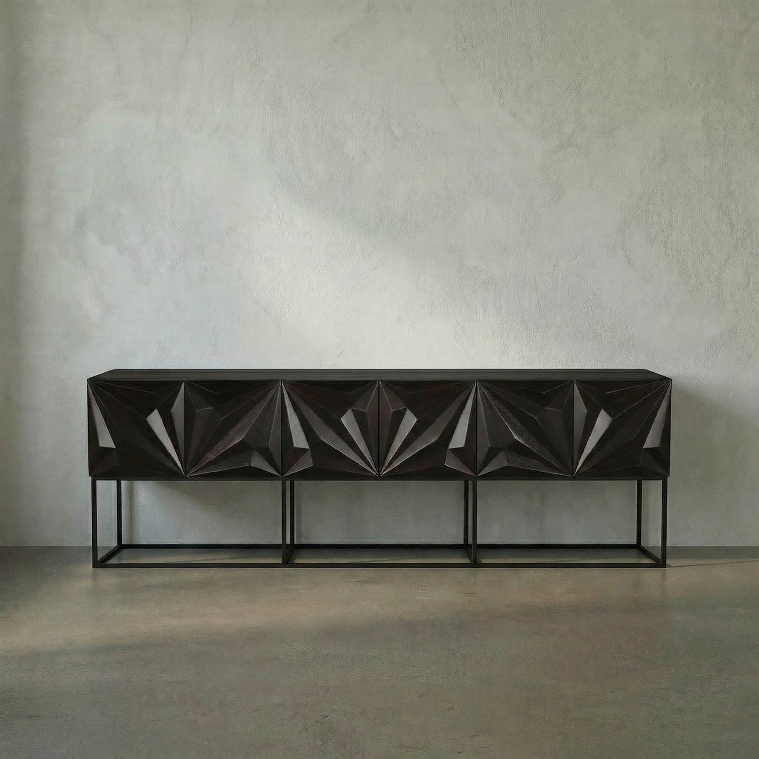 This four-door, two-compartment cabinet in Ebony Walnut features bold, faceted front panels carved in a striking geometric starburst design. Elevated on a minimal black metal frame, it blends sculptural detail with modern sophistication and functionality.